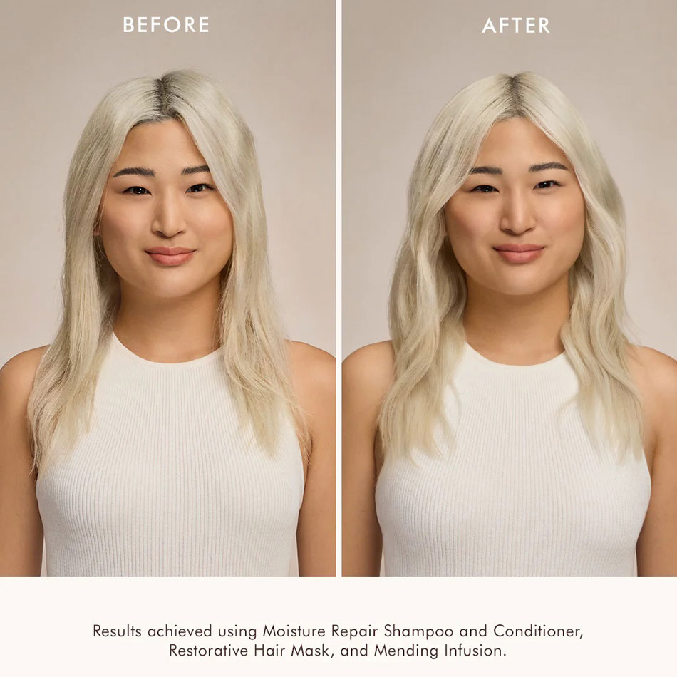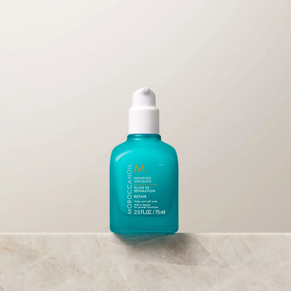 Appliquez une noisette dans les paumes des mains et travaillez dans les cheveux secs, en insistant sur les pointes. Réappliquez sur les pointes sèches et/ou fourchues pour revitaliser et lier la fibre capillaire, selon les besoins.